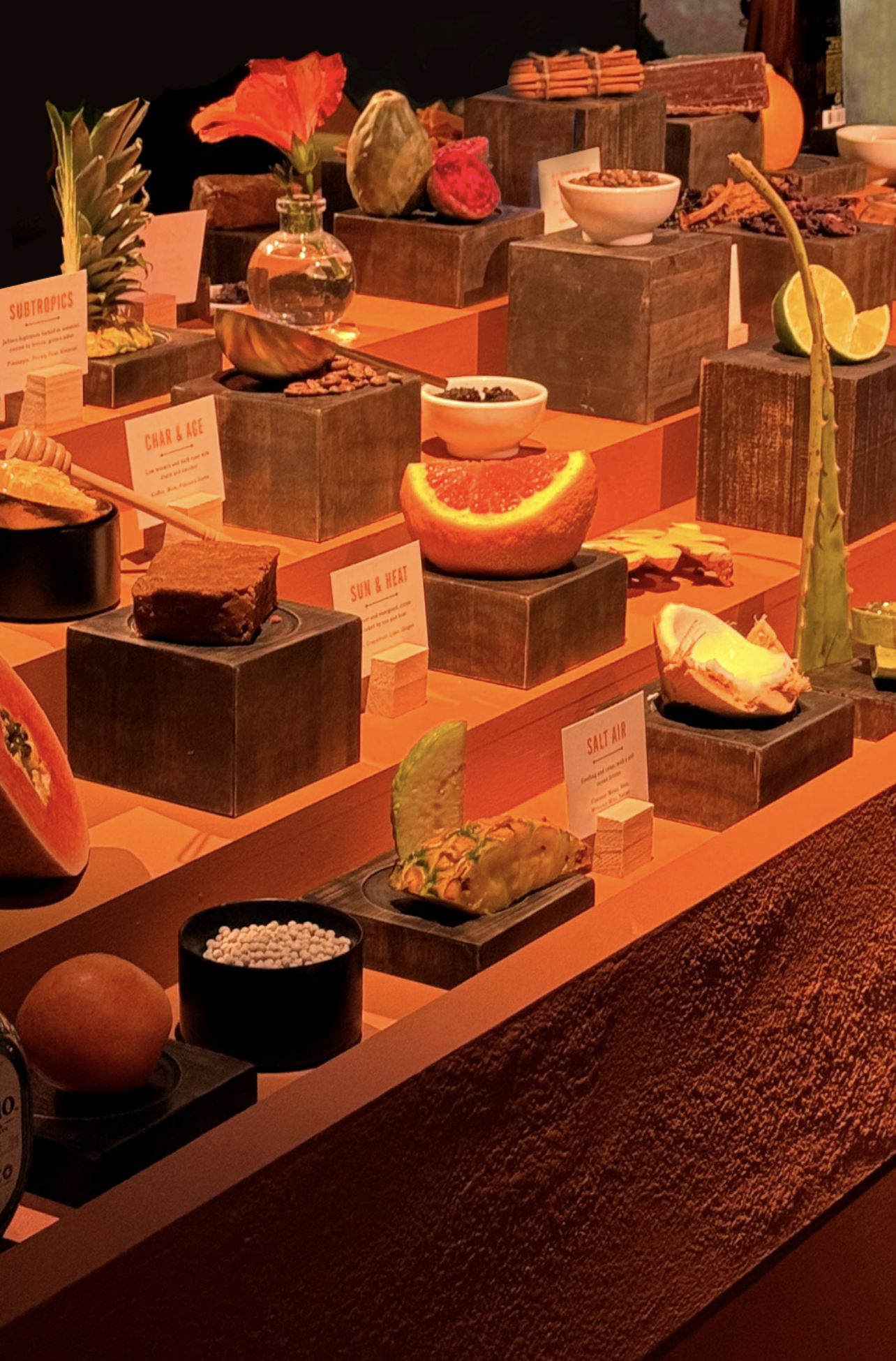 We designed a sculptural, multi-level display composed of charred wooden blocks, each holding a key ingredient from the cocktail palette. The form and materiality were inspired by the earthy tones, textures, and traditions of Mexico, grounded, warm, and elemental.